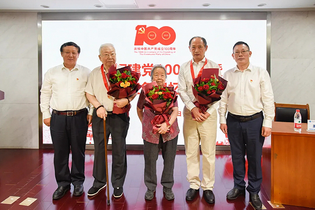建党100年,党龄50年。恒天集团党委书记、董事长刘海涛,党委副书记、总经理颜甫全向离退休老党员代表曹东升(党龄68年)、郭春梅(党龄68年)、李怀岭(党龄51年)颁发了“光荣在党50年”纪念章,新党员代表为老党员献上鲜花。这几位离退休老党员深情表示,中国共产党的一百年既是艰苦奋斗的一百年,也是取得辉煌成就的一百年,我们虽然离开了工作岗位,但心与公司是始终相连的,会继续大力传承红色基因,余生用忠诚继续谱写生命乐章。